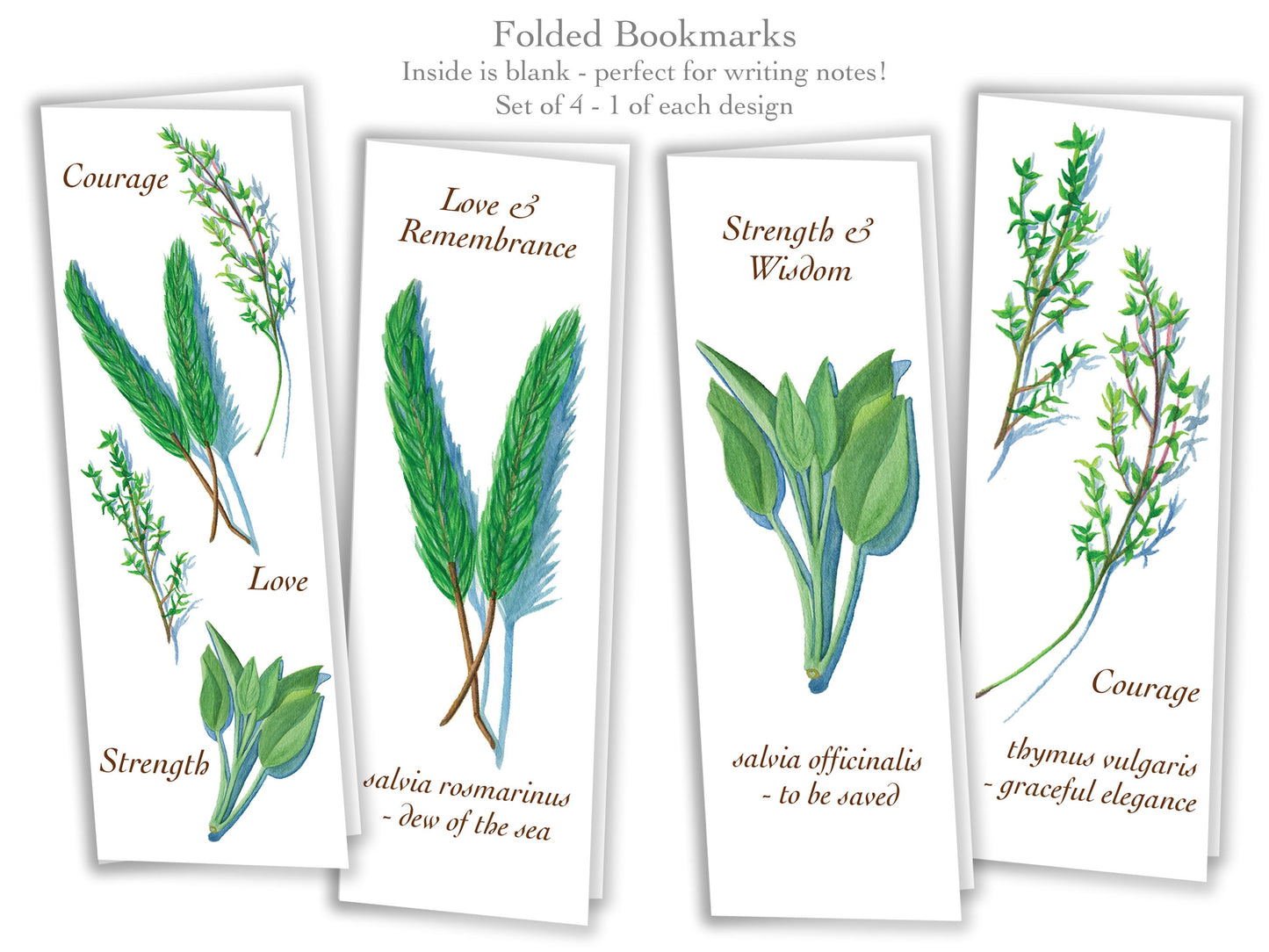 • Each of 3 bookmarks feature the Latin name for the herb shown and a historical, representational meaning of the herb. The 4th bookmark - herb mix - shows historical, representational meanings. (images shown above)
