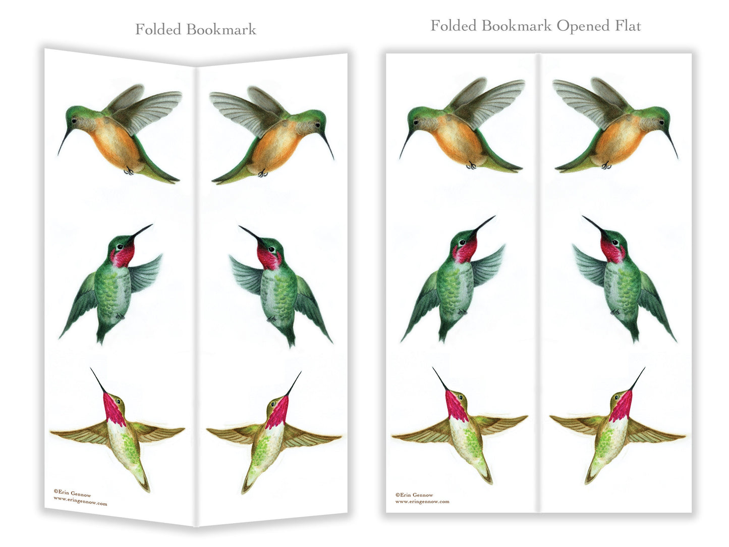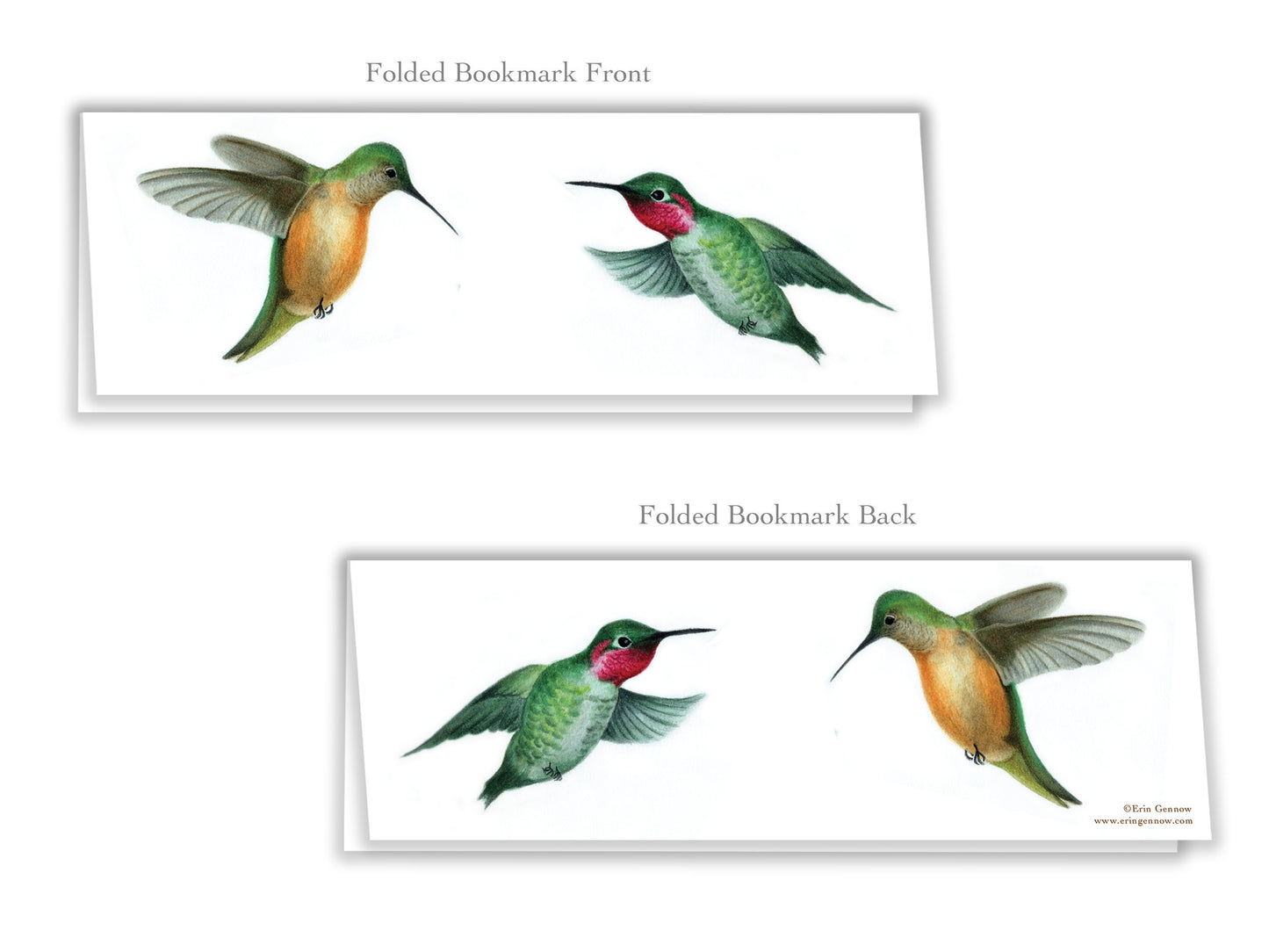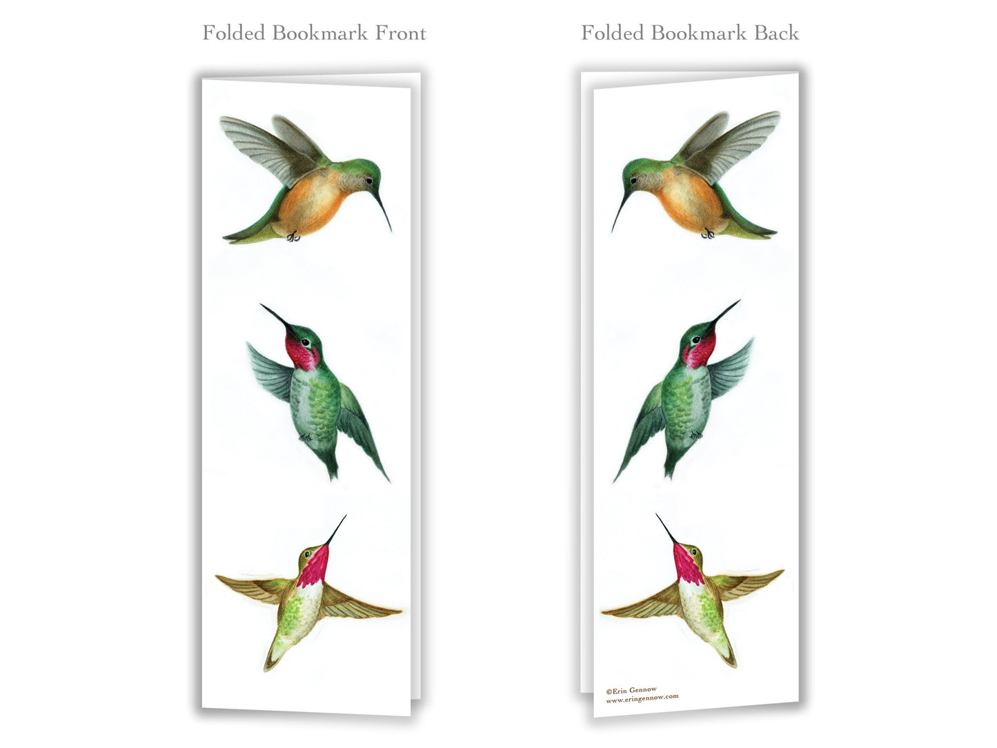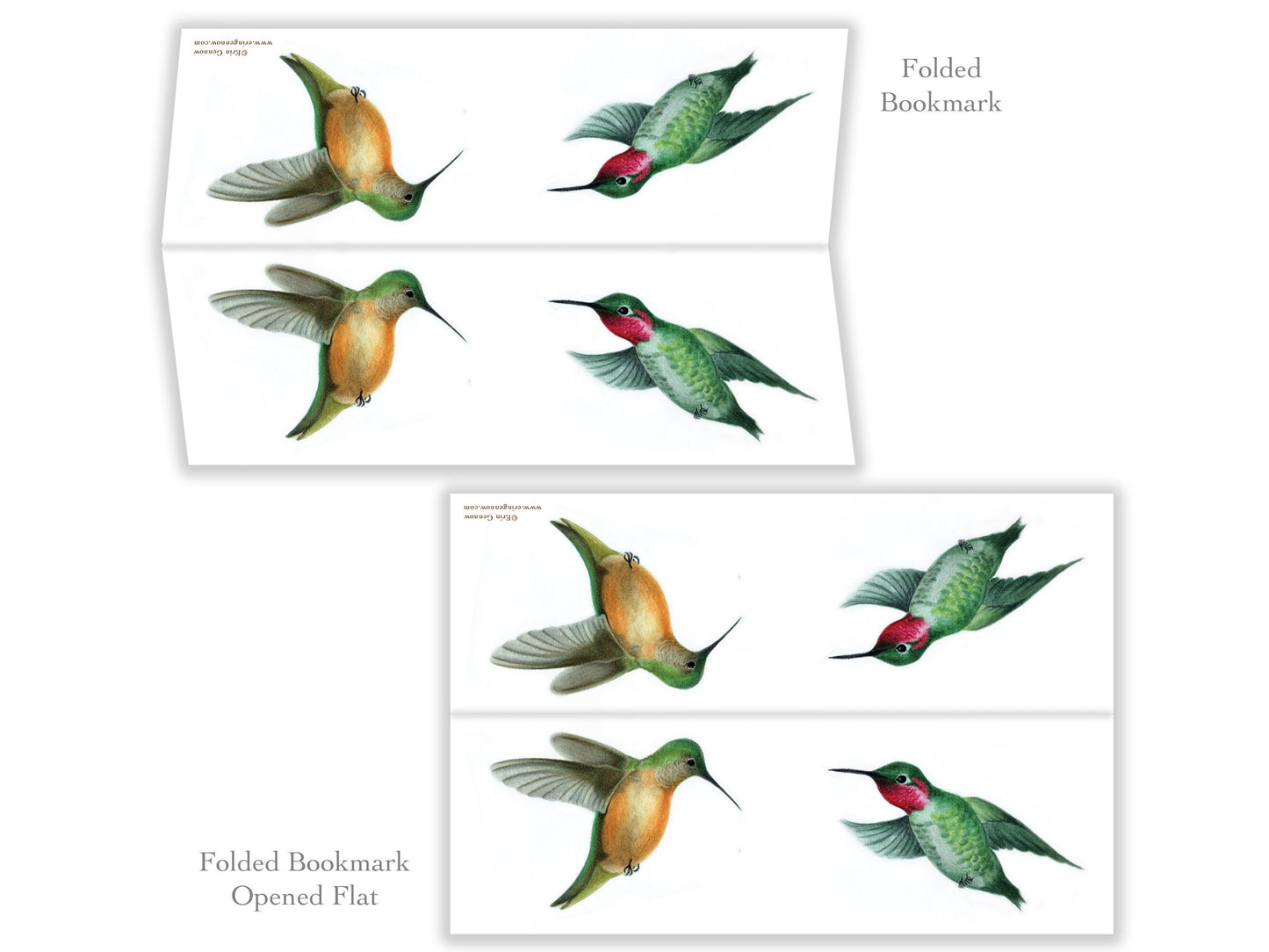 • Set of 4 Folded Bookmarks - The Hummingbird Series - featuring reproductions of 4 original watercolor illustrations. 1 bookmark of each design.