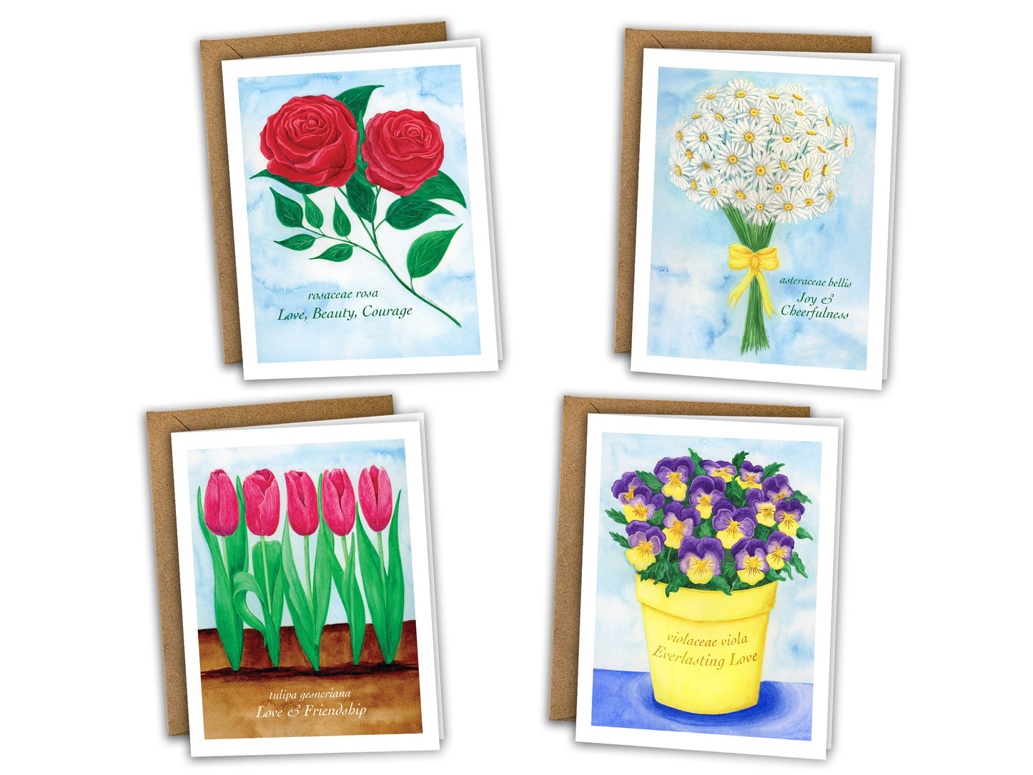 • Floral Series greeting card set - 4 unique watercolor illustrations (2 of each design) featuring 4 different paintings - Roses, Daisies, Tulips and Violets - a total of 8 cards.