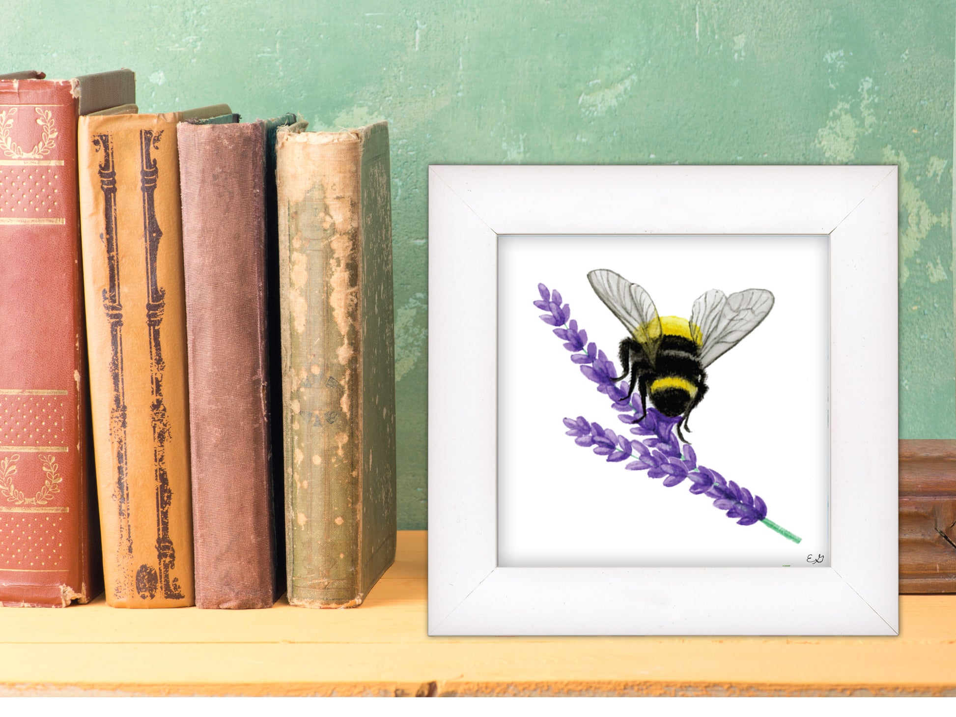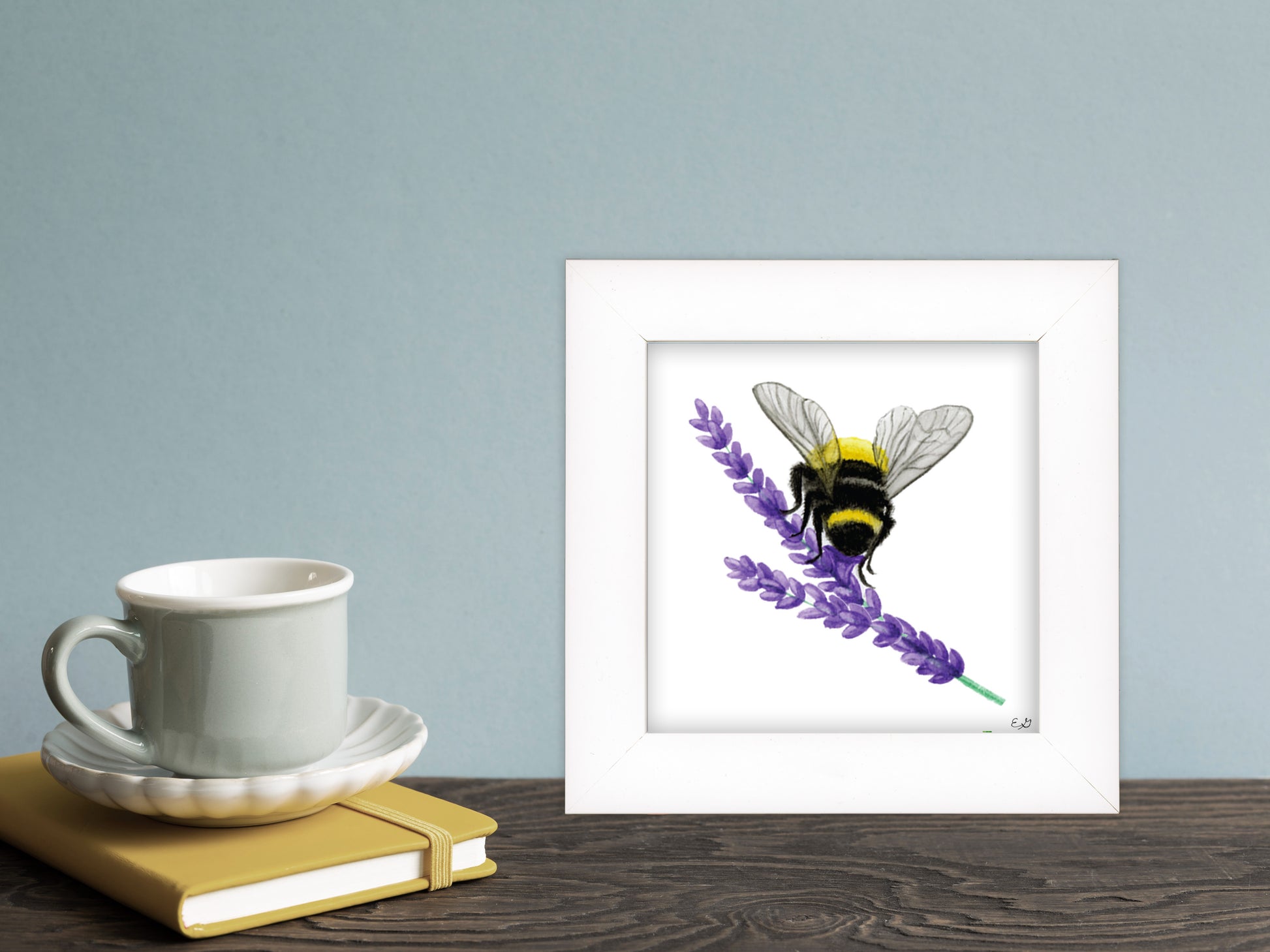 • 1 Fine Art Print - Little Bee on Lavender in a 4" x 4" white wood frame.